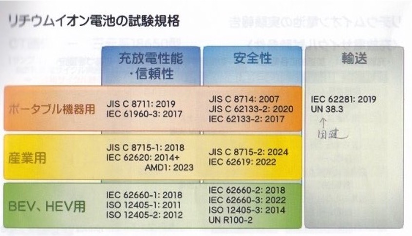 リチュウムイオン電池の種類やそれに伴う規格などについても公演があり、安全規格