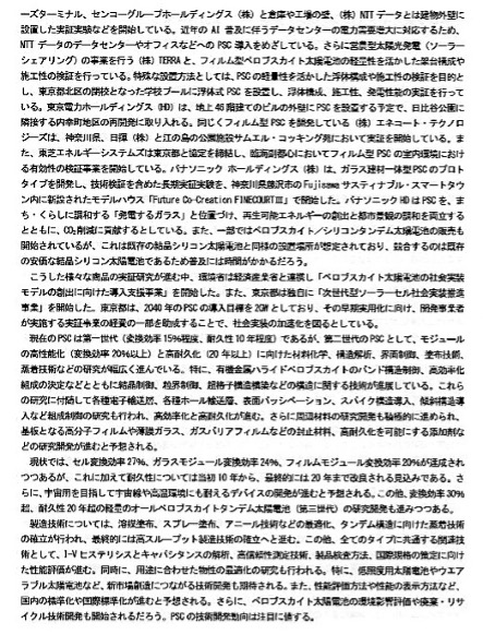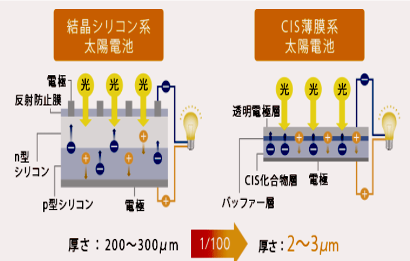 「普通、太陽電池セルの厚みは結晶系シリコン太陽電池が約200〜300μメートルであるのに対して、CIS太陽電池は1/00程度である約2〜3μmでPSC太陽電池(ペロブスカイト太陽電池)はさらに薄く1μmにも満たない非常に薄いから故の特徴が存在している。」