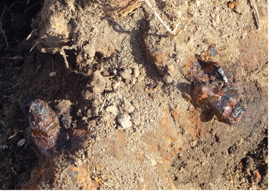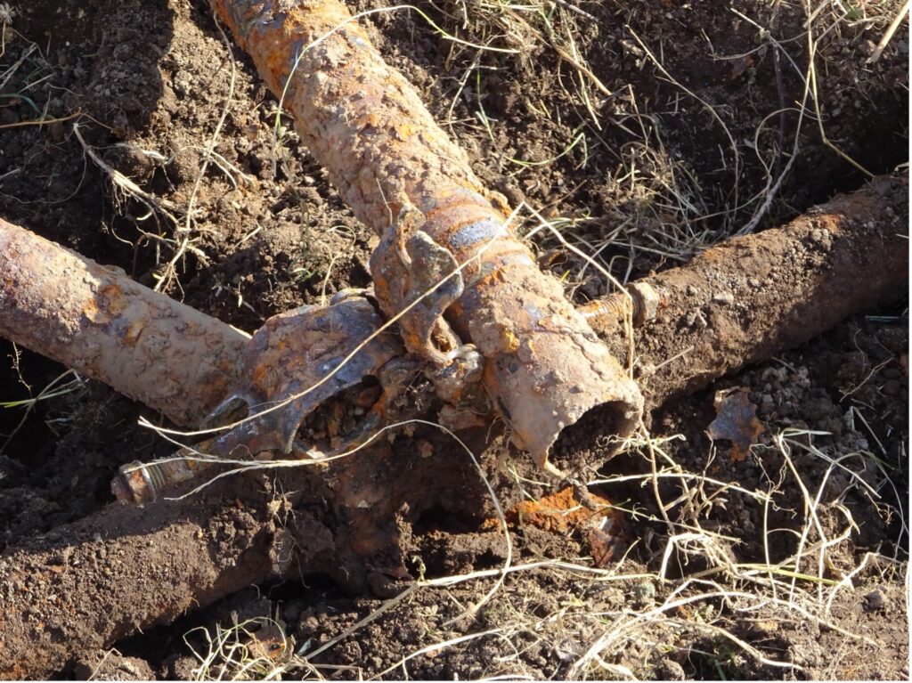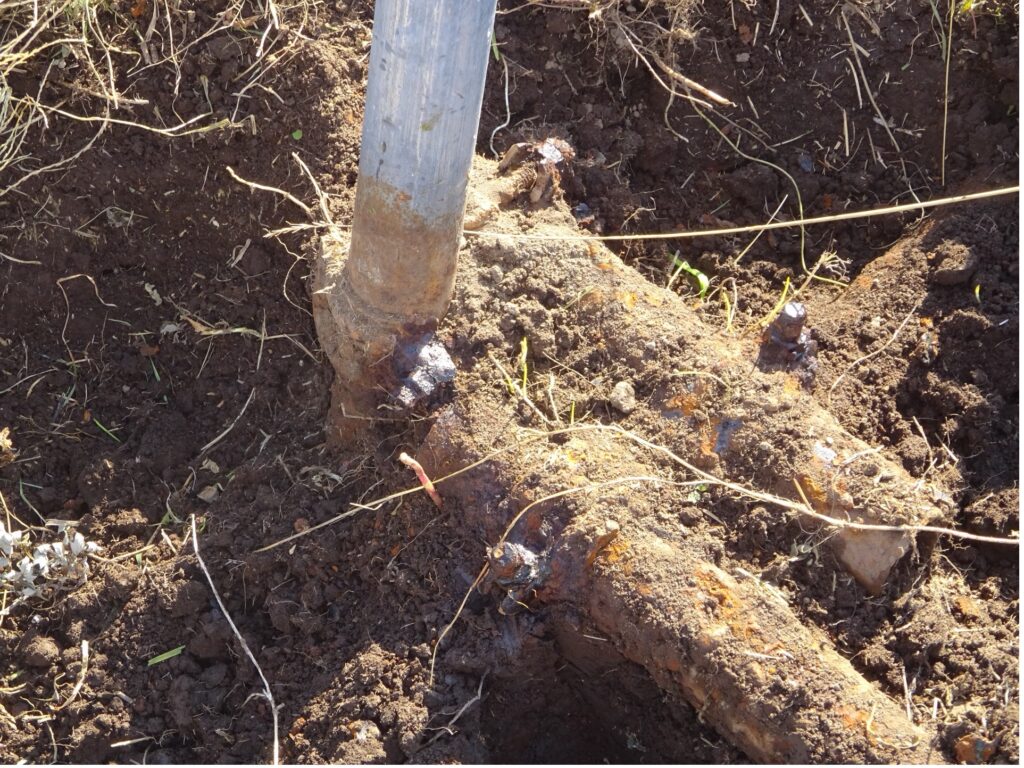 上の写真は、地中部分の掘り出し写真です。クランプの劣化が激しいのが確認できます。地中部分のクランプについては、連結部分を掘り出して、ネジを緩めて外すことにしていましたが、ネジ部の折れが多発したため、叩いて外したところ