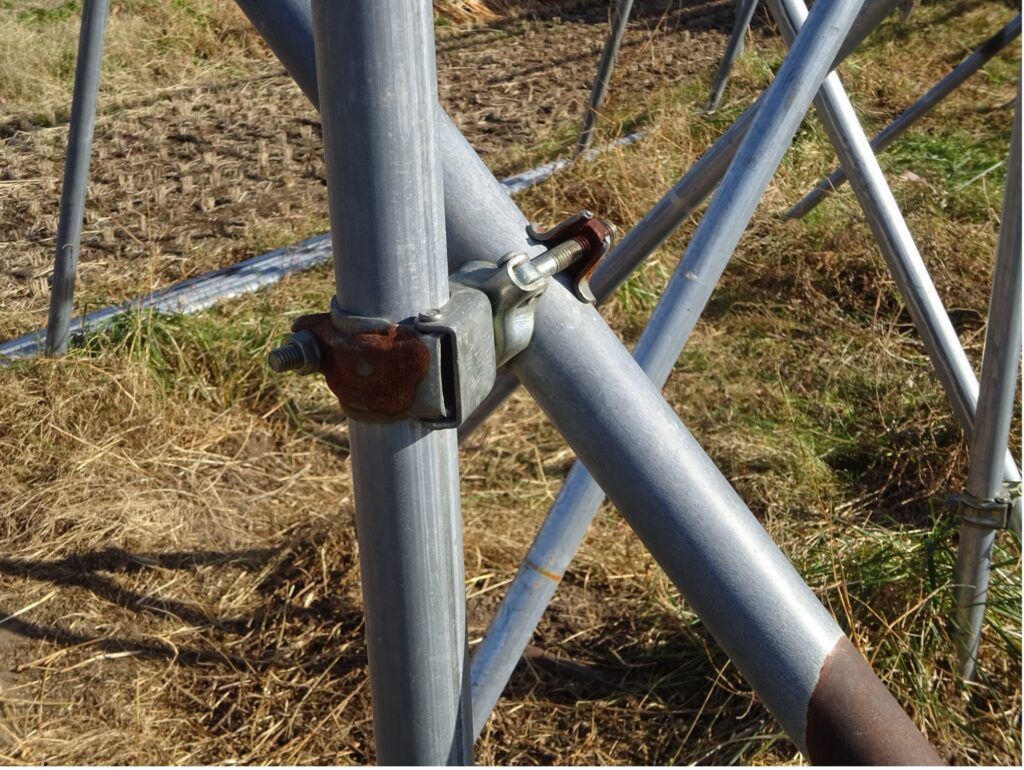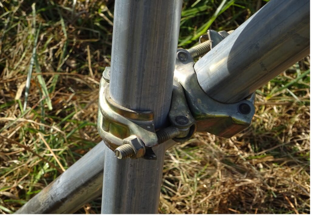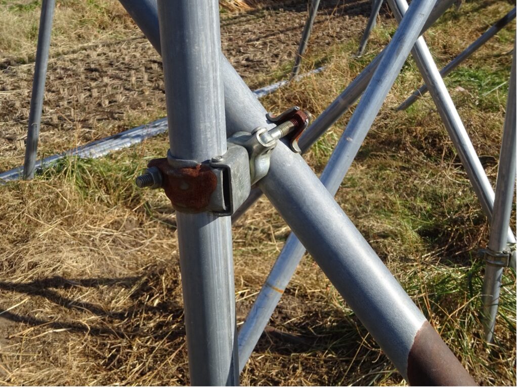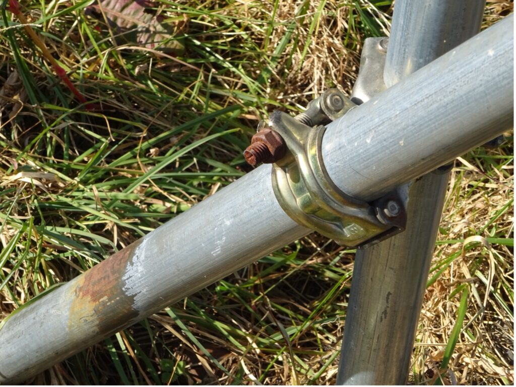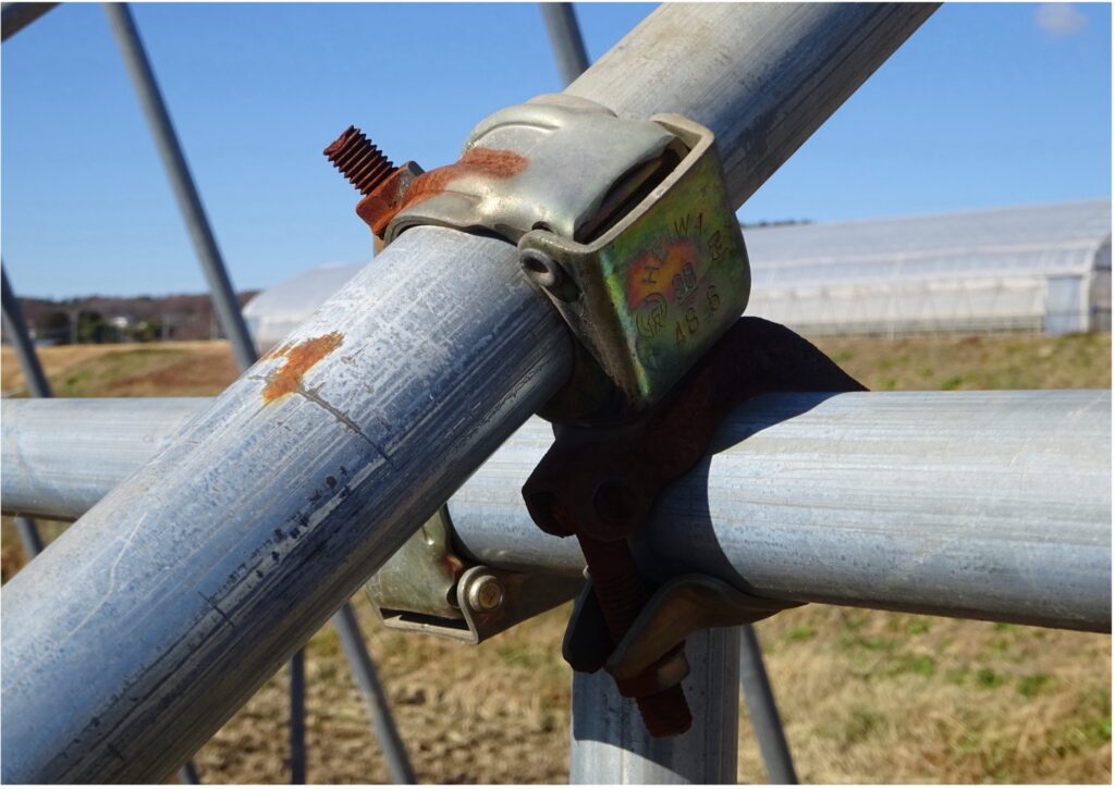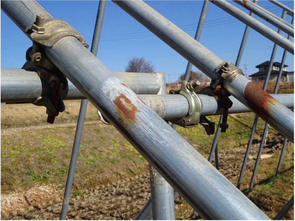 横方向の単管パイプの上下の差で、雨水が当たる場所と当たらない場所では、クランプに発生する錆の違いが確認できます。
