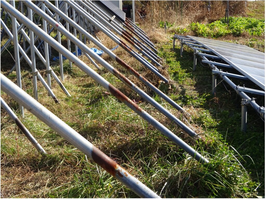 太陽電池からの雨だれが当たる部分の単管パイプに、規則正しく錆の発生している様子が確認できます。