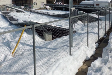 積雪1.5m大雪で大破したアルミ架台・方や、大雪に耐えた単管パイプ架台