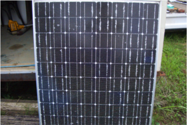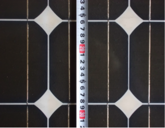 この場合は、出力は急速に低下して、直列している他の太陽電池に悪影響を及ぼすので、他のものと交換致しました。セル間の苛電圧部分のリーク痕が現れています。