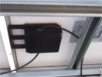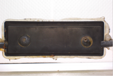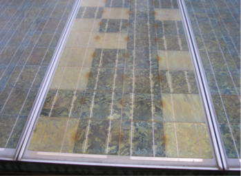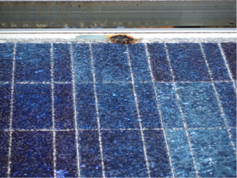 こちらは、長年の使用により、ジャンクションボックスの電極部分に不可がかかり、電極近くに劣化が見られる写真です。これらの劣化を防ぐ方法として、当時の研究者は接合部の面積でカバーする方法が一番でしたが、太陽電池自体が丸い単結晶では、配列の都合上隙間ができるので可能でしたが、多結晶タイプだとかなり御苦労されたようです。(この症状が悪化すると、表面ガラスの破損に繋がる(20年経過))