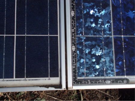 現在の太陽電池は、一枚のセルの大きさが、かなり大きくなるのと、表面処理の技術向上から、目で見ても判断不能なクラックが発生している場合があり、これらも、これから起こりうる太陽電池の出力低下の原因になるかと思われます。