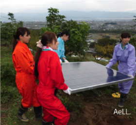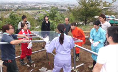 と知り合い、今回、太陽電池設置のお手伝いをすることになりました。今回は、彼女たちが手作りで、作ることが出来る移動式の太陽電池架台を特別に設計して、エール村の農業施設の一角に置くことができるようにしました。