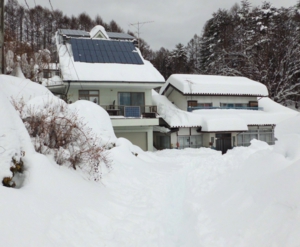 今回は、150㎝を超えておりましたので、3日後、近くの太陽光発電施設宅でも、雪下ろしをしていましたが、屋根の上は非常に危険なので、あまりおすすめはできません。太陽電池を屋根に載せてあるお宅では、落雪事故に配慮が必要です。