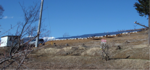 市内には、太陽光を充分確保するために、山腹に太陽電池を設置する業者もあり、それらの設置場所には、排水路設備が無く、山腹からの土砂流失が懸念されます。   急傾斜地設置例
