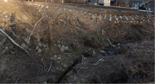 豪雨時には、小さな小川も川幅が広がるので、法面の処理は正しく行わないと流出崩落の危険性に見舞われる恐れがある。