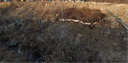 こちらは、高さ1m以上ある裏面ですが、既に自然崩落が発生しているので早期に、法面形成を行うか、被服のために法面に芝の種等を散布して、崩落を防止する措置が求められる。