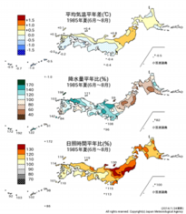 各、季節ごとに比較をしてみると、統計期間100年間において、どの季節においても、海水面の温度は、上昇しており、日本周囲を回遊する回遊魚の魚種の変化と、沿岸魚の魚種変化は、高温海の広がりにより免れないことが確認できます。これらの影響は、海だけにおさまらず、日本列島全体に対しても、温度上昇を招き、100年間で、日本列島全体温度の年間平均温度を1度以上の上昇を招き、温暖化を着実に進めているのです。