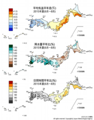 30年間の6月〜8月の平均温度と降水量平年比と日照時間平年比を比べてみました。ここで、確認したいことは、平均気温平年差が、30年と言う単位で比較してみると、日本列島の中心付近に分布してあった温度差のあまりない地域が、明確になり、特に、日照時間と連動していないと読み取ることができることです。では、海水温からは、どんなことが読み取れるでしょうか。
