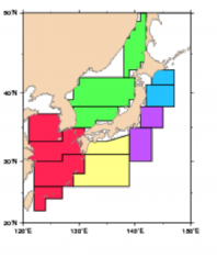 日本を囲む海域を色分けしたブロック13海域のごとの海域平均値を、各海域の面積に応じて、重みを付けて平均した値を表したものです。