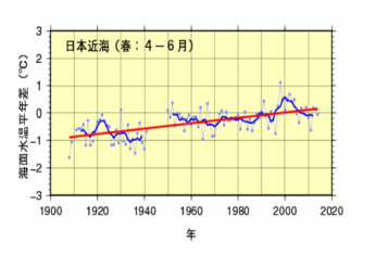 日本列島近海の海水温度の上昇は、思わぬところで、私たちに牙を剥いてきます。このまま、日本列島近海の温度上昇が続けば、私たちの食卓から、なじみのある魚が、消えて行くことになります。漁業資源と言う面においても、温暖化は、牙をあらわしており、それに対応した資源開発が急務になって来ており、近畿大学の取組みに期待が集まっています。(Newton別冊などで紹介)