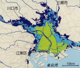 もし、冠水が発生したならば、その期間は、長期に渡り、都市機能を奪うことになり、場所によっては冠水の深さが5mを超えて発生する予測もあり大阪地区の淀川の冠水は東京同様人口密集地にあり、大都市の脆弱性を秘めており、普段からの対策を、今、一度感考え、災害に備える必要な時期に来ていることをお知らせ致します。冠水予想図はこちらになります。