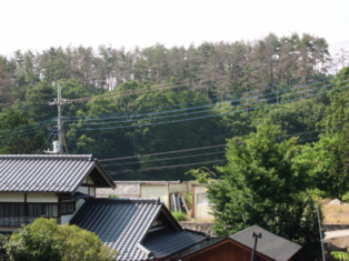 こちらの写真は、我が家から東の山裾を眺めたもので、写真中央部が赤く変色している山林を捉えています。右の写真は、赤く変色した山林に近寄って確認した写真です。
