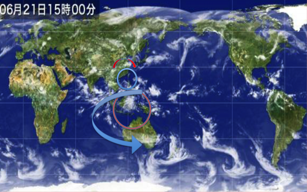 地球規模で広げて確認しても、赤道付近で発生した雲の流れが、大気循環モデルと符合しない、大気の流れが南半球で起きているように見えるのです。規模も大きく、インドネシアからニュージーランドまで、広がる青色の矢印で示している雲の流れは、どんな気象条