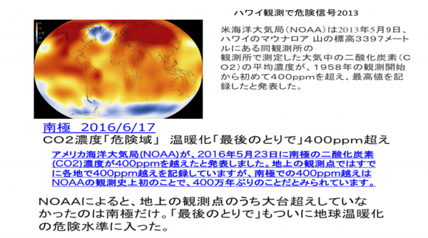 2016/06/17の発表で、南極大陸での二酸化炭素濃度が400ppmを超え、最後の砦と言われていた南極大陸でも地球温暖化の危険水準に入ったと思われるとアメリカ海洋大気局(NOAA)の発表。