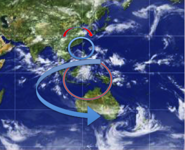 赤道で発生した、大気の流れが低気圧や高気圧の発生により乱れるのは分かりますが、赤道貿易風の流れが、オーストラリア大陸内部をへて、ニュージーランド先の低気圧まで繋がる雲(大気の流れ)意味するも?