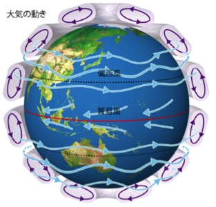 大気循環モデルの交易風と偏西風が直接交わるには、大きな台風などが必要になるが、それが無い状態での交易風と偏西風の交わりで