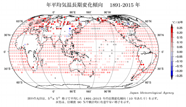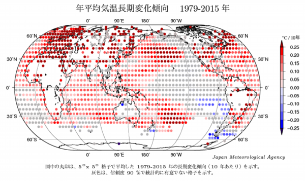 これらの観測図から判断できることは、人類の活動が活発になるにつれ、地球の表面気温が上昇していることを表しています。人類が、地球規模で観測を始めた1970代から2015年までの短時間で、著しく温度が上昇していることが、これら観測から判断できます。