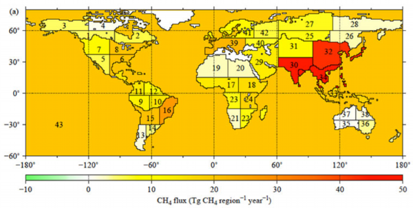 ※ 地上観測データと「いぶき」の観測データから推定したメタンの年間正味収支量(2009年6月~2011年5月までの月別収支量に基づく結果)。単位は「Tg CH4/地域/年」。すなわち、地域当たり年当たりのメタン換算の質量総量。No.30, 32, 34の東アジアや東南アジア地域のメタンの放出量が多いことがわかる。