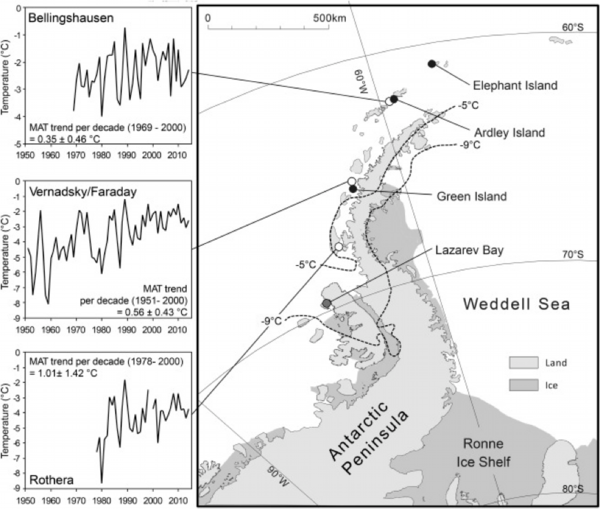 どの観測地点でも、1980年代から現在まで、気温の上昇傾向にあり、苔類の繁殖は、30年間で南緯60度付近から南緯70度付近まで進出していることです。