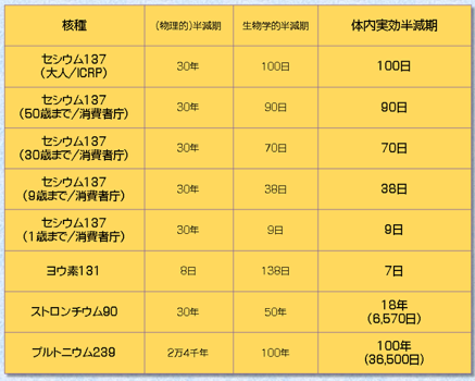 事故後、各サイトから発表された放射性物質の半減期(ネット資料引用)資料