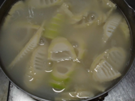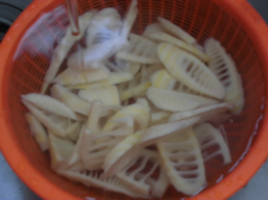 朝になりました。 やわらかくなったタケノコを充分、水にさらして