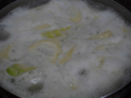 後は、具材の八分目くらいまで、水で薄めて、火にかけます。(中火)