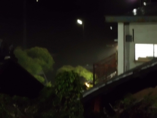 隣家はライトに浮かび上がりながら、風雨に曝されています。